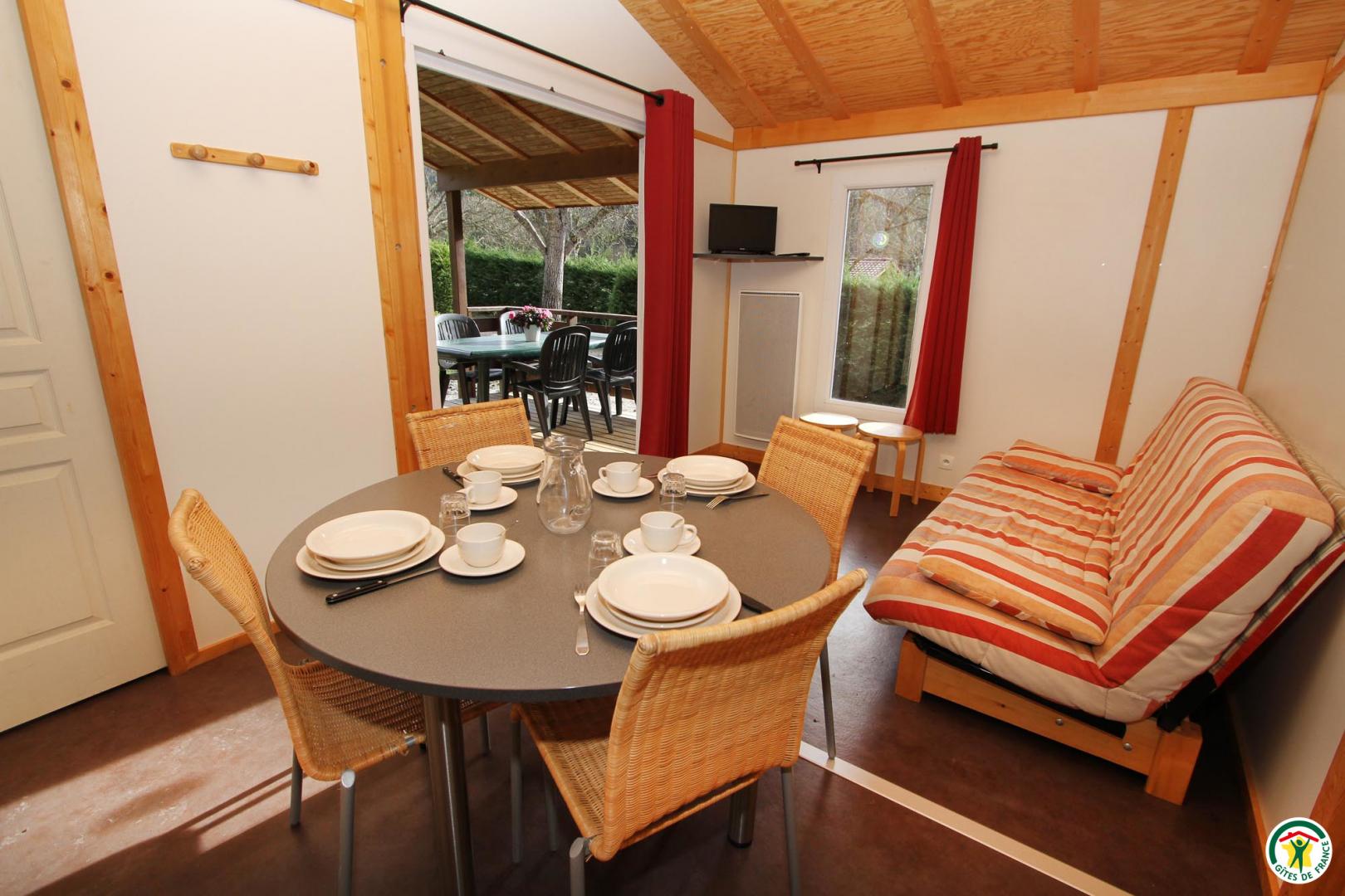 Les six chalets conçus en bois sont tous indépendants. D'une surface de 35m2, ils peuvent accueillir jusqu'à six personnes. L'un d'entre eux est accessible aux personnes à mobilité réduite. Chaque chalet est doté d'une terrasse, d'un séjour avec cuisine (clic-clac 140), de deux chambres (1x140)(2x80), d'une salle de bain et des toilettes. La location de votre chalet inclut l'accès à la piscine.